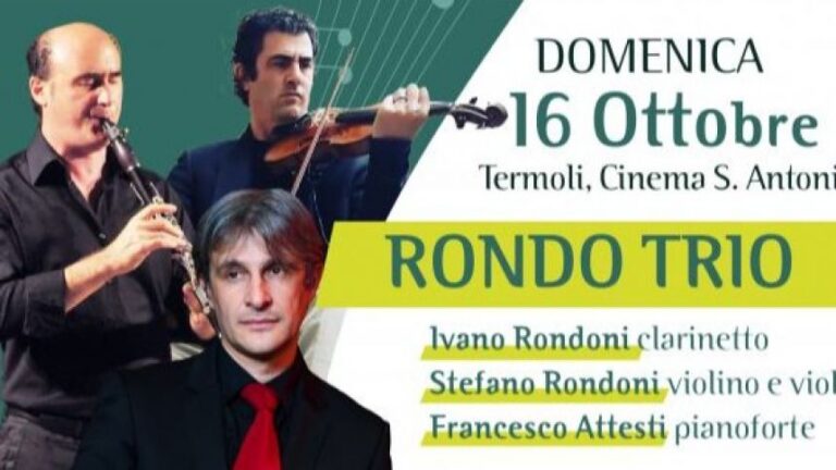 TERMOLI. L’associazione servizi culturali “Ondeserene” è lieta di invitare al concerto del RONDÒ TRIO, composto da Ivano Rondoni (clarinetto), Stefano Rondoni (violino e viola) e Francesco Attesti (pianoforte), il giorno 16 ottobre 2022 alle ore 18.00 presso il Cinema S. Antonio di Termoli. Il programma prevede brani di A. Kachaturian, F. Poulenc e A. Tumiatti.