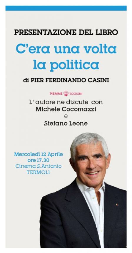 TERMOLI. Dopo l’evento in provincia di Isernia, il senatore Pier Ferdinando Casini, storico leader dell’Udc e già presidente della Camera dei deputati tra il 2001 e il 2006, sarà oggi a Termoli, al cinema Sant’Antonio, per presentare il suo libro intitolato “C’era una volta la politica”.