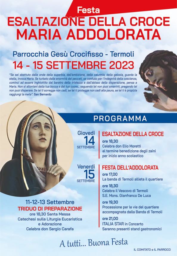 Il triduo di preparazione inizierà domani sera, lunedì 11 settembre, alle 18.30, nella santa messa alla chiesa del Gesù Crocifisso, con la catechesi sulla Liturgia eucaristica e l’adorazione, per tre sere di seguito, fino a mercoledì 13 settembre, con don Sergio Carafa.