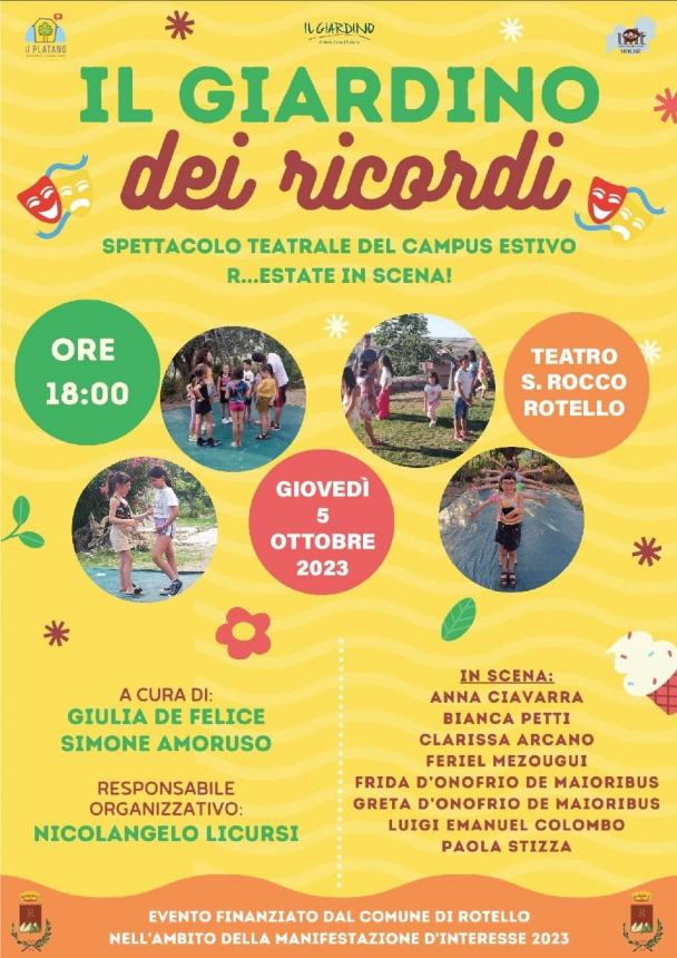 ROTELLO. Oggi pomeriggio, giovedì 5 ottobre, alle ore 18, presso il teatro di San Rocco a Rotello, si svolgerà lo spettacolo teatrale del campus estivo “R…estate in scena”, dal titolo “Il giardino dei ricordi”.