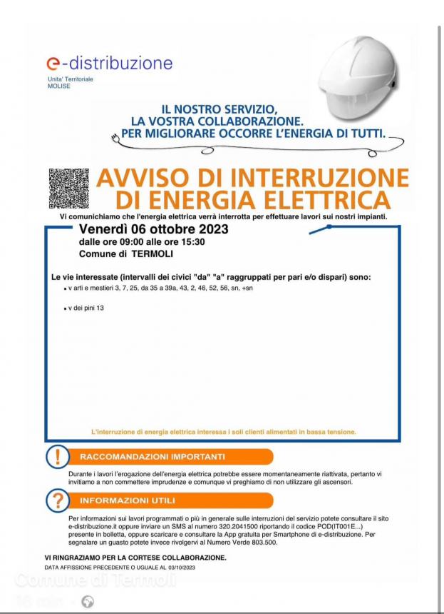 L’interruzione di energia elettrica interessa i soli clienti alimentati in bassa tensione. Durante i lavori l’erogazione dell’energia elettrica potrebbe essere momentaneamente riattivata, pertanto vi invitiamo a non commettere imprudenze e comunque vi preghiamo di non utilizzare gli ascensori. Per informazioni sui lavori programmati o più in generale sulle interruzioni del servizio potete consultare il sito e-distribuzione.it oppure inviare un SMS al numero 320.2041500 riportando il codice POD(IT001E…) presente in bolletta, oppure scaricare e consultare la App gratuita per Smartphone di e-distribuzione. Per segnalare un guasto potete invece rivolgervi al Numero Verde 803.500.