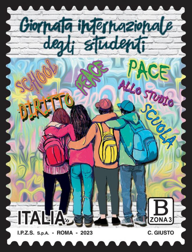 Completano il francobollo la legenda “Giornata internazionale degli studenti” la scritta “Italia” e l’indicazione della tariffa “B zona 3”.