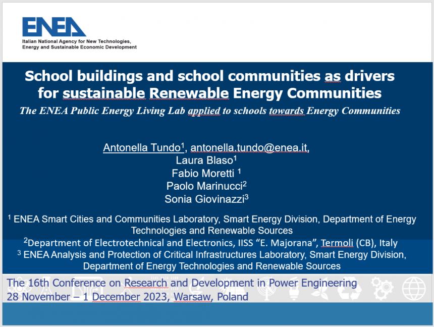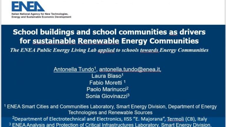 In particolare all’interno della sessione_B2 c’è stato il contributo dal titolo: “School buildings and school communities as drivers for sustainable Renewable Energy Communities” che vede come autori l’arch. Antonella TUNDO, arch. Laura BLASO ed ing. Fabio MORETTI (ENEA Smart Cities and Communities Laboratory, Smart Energy Division, Department of Energy Technologies and Renewable Sources), il prof. ing. Paolo MARINUCCI (Department of Electrotechnical and Electronics, IISS “E. Majorana”, Termoli -CB-) e l’ing. Sonia GIOVINAZZI (ENEA Analysis and Protection of Critical Infrastructures Laboratory, Smart Energy Division, Department of Energy Technologies and Renewable Sources).