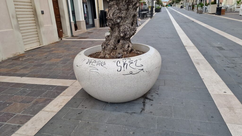TERMOLI. Si corre subito ai ripari contro le conseguenze di gesti sconsiderati e scriteriati, come gli atti di vandalismo, che e nemmeno dopo 12 ore dalla loro comparsa, avevano imbrattato con scritte e ‘segni’ (i disegni sono altro…) i vasi messi a dimora con gli alberi sul Corso Nazionale, così come altri arredi urbani.