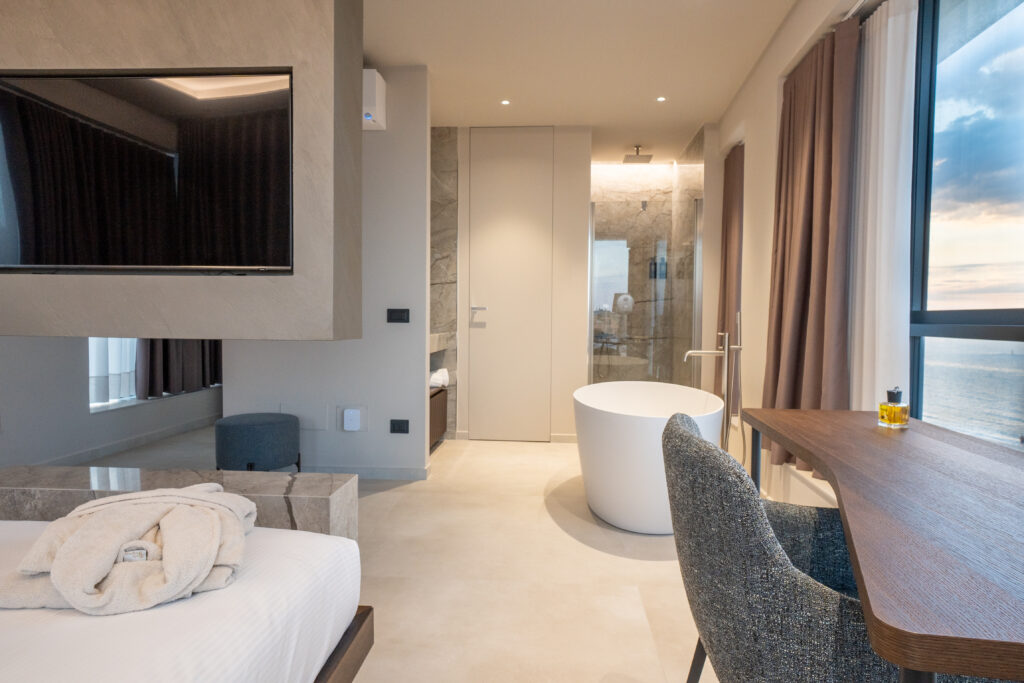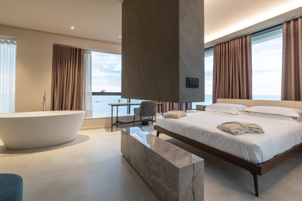 La struttura dispone di 14 appartamenti e 5 suite, spazi ampi e luminosi che rappresentano il perfetto equilibrio tra design contemporaneo e calore mediterraneo. Ogni ambiente è curato nei minimi dettagli, con soluzioni che spaziano da terrazze private a suite che offrono il privilegio di una raffinata vasca da bagno con vista mare, un tocco di eleganza che sottolinea l’attenzione e la cura dedicate a ogni spazio. L’obiettivo è creare un’atmosfera accogliente e curata, capace di garantire un soggiorno di totale relax.