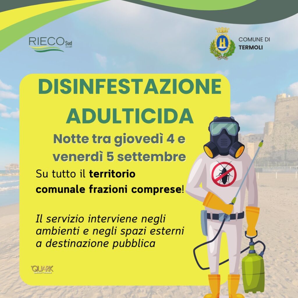TERMOLI. Disinfestazione a Termoli: il Comune ha annunciato un’importante operazione di disinfestazione adulticida su tutto il territorio comunale, prevista tra giovedì 4 e venerdì 5 settembre 2025, durante le ore notturne e le prime ore del mattino. L’intervento è mirato al controllo della popolazione di insetti adulti, in particolare zanzare, e rientra nelle misure di tutela della salute pubblica. Cosa devono fare i cittadini?
