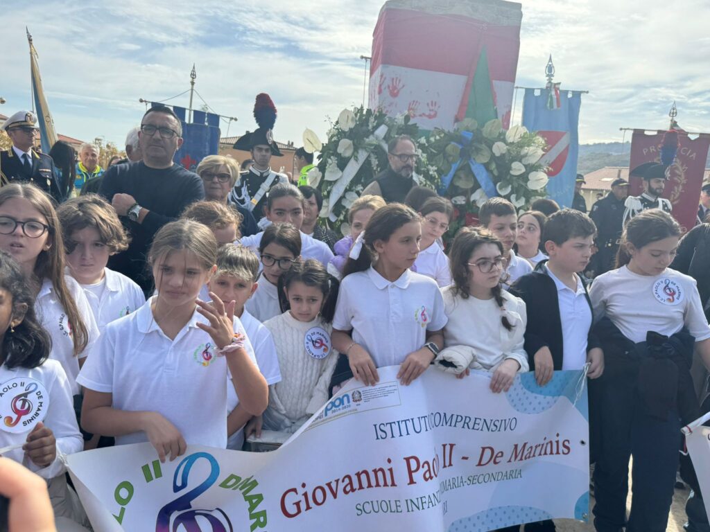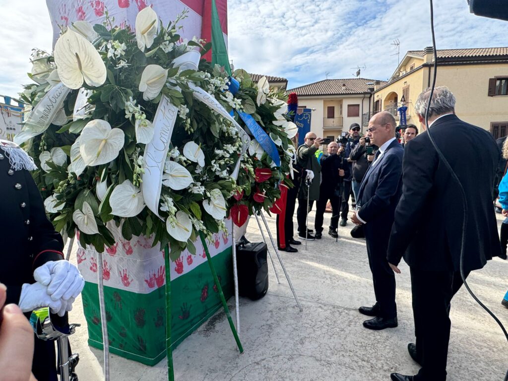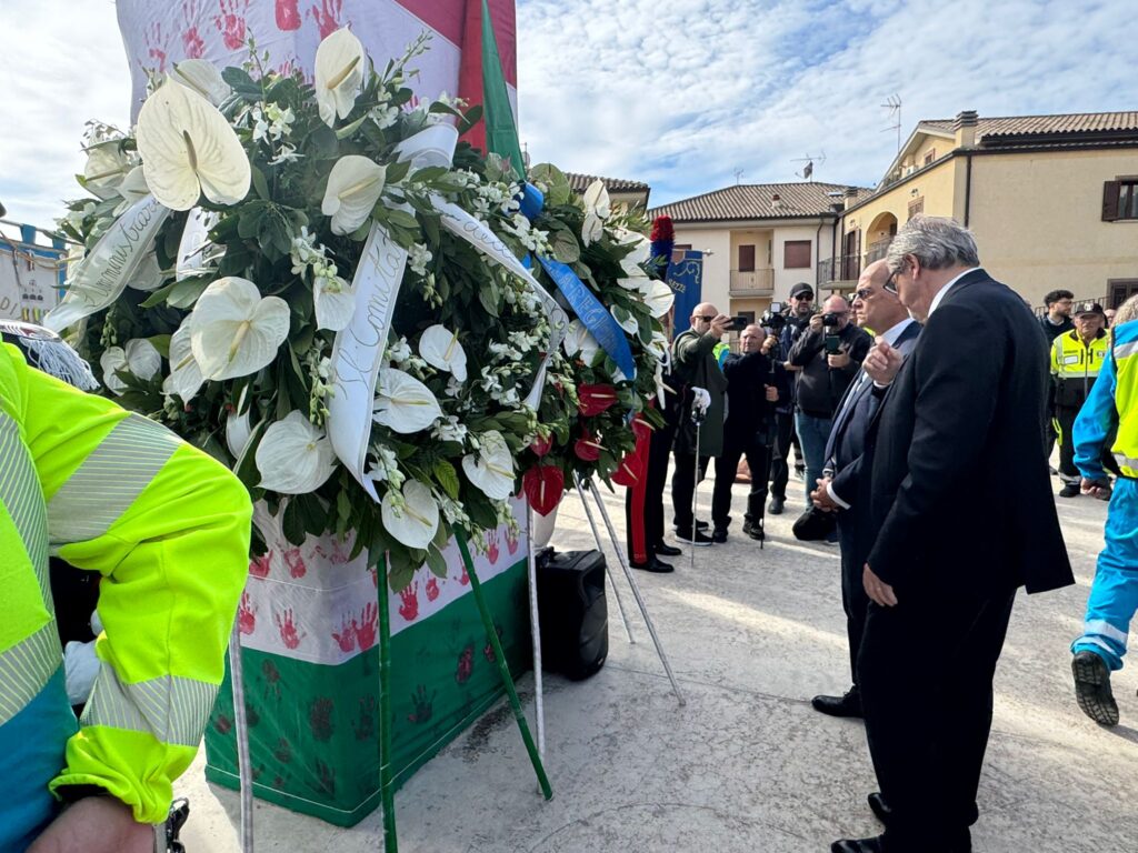 Il cammino dal cimitero al Parco della Memoria, costruito sulle macerie della scuola crollata, è lento e rispettoso. I giunchi artificiali che punteggiano i percorsi creano piccoli spazi di meditazione, dove il silenzio diventa parola e il ricordo si trasforma in sentimento condiviso. Le corone di fiori deposte intorno al pilastro della Jovine e tra le lapidi dei banchi non sono solo un omaggio: sono un gesto di presenza, di cura, di responsabilità verso chi non c’è più.