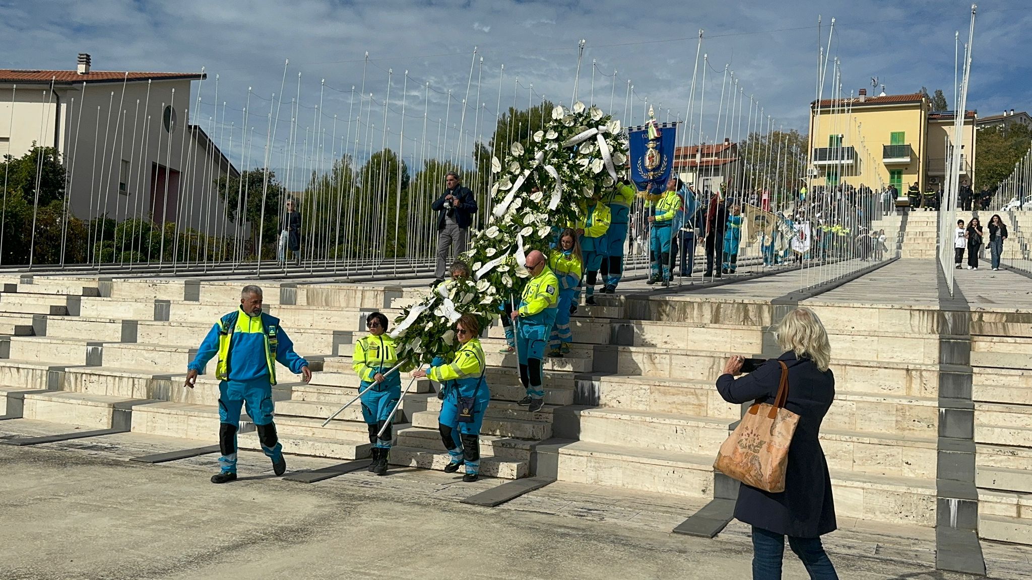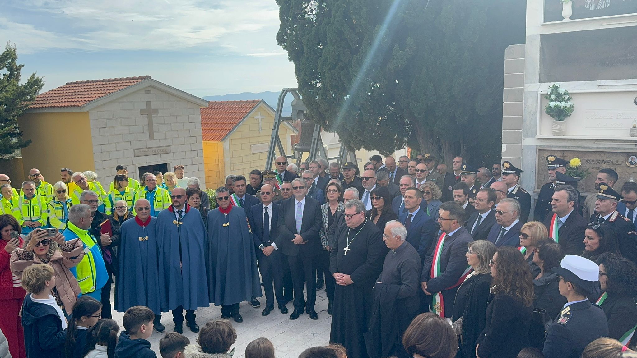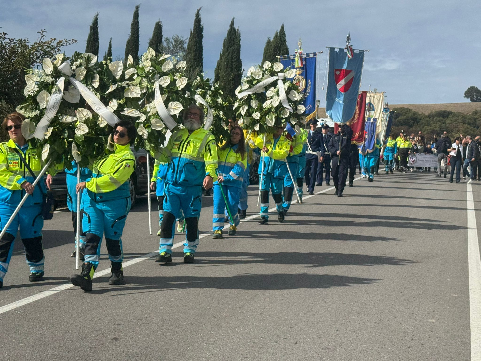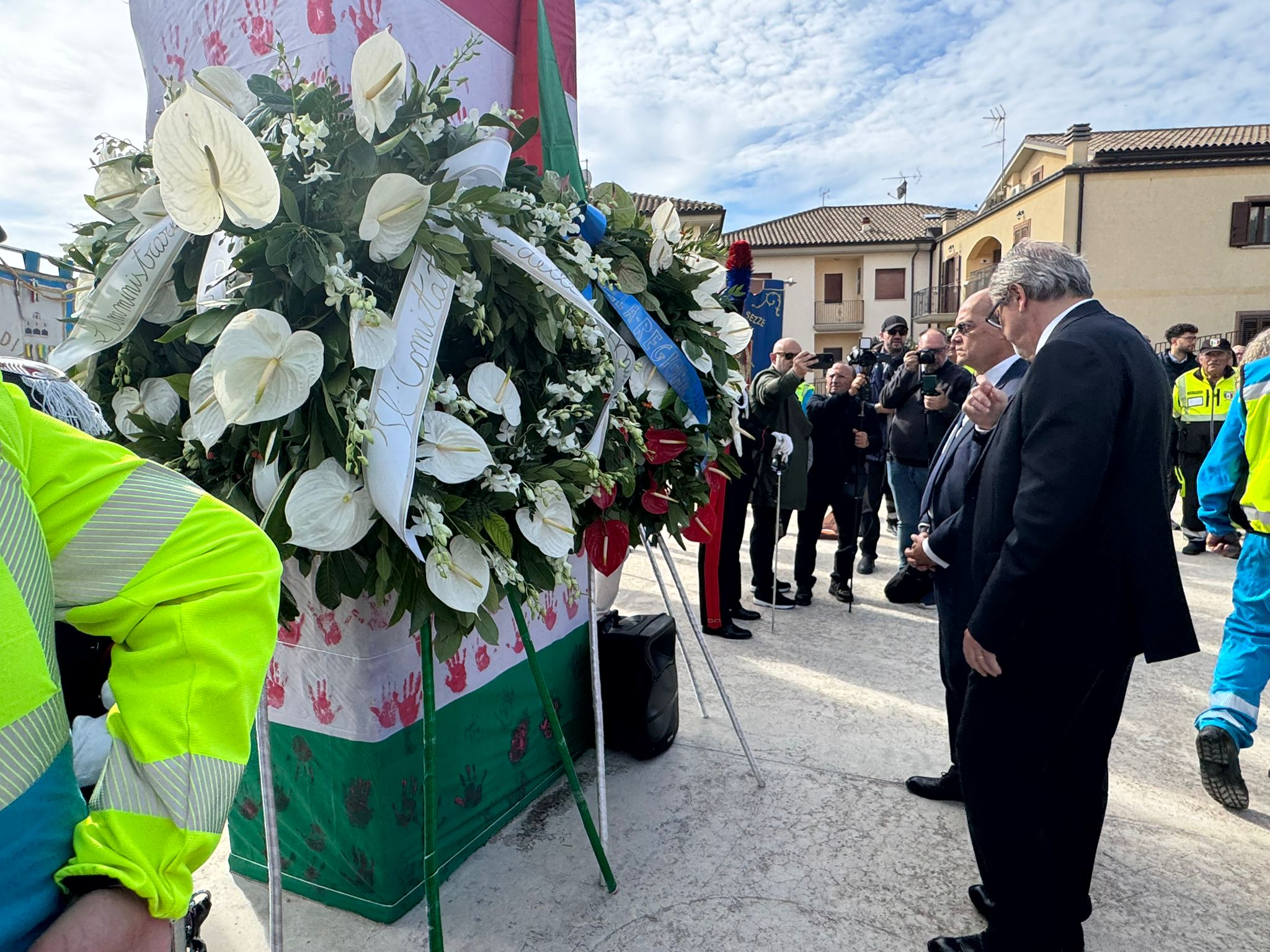 Le autorità civili e militari, i volontari, i rappresentanti dei comitati delle vittime di stragi e calamità, insieme a chi quel giorno c’era, si raccolgono al cimitero. Gli sguardi sono fissi, le mani si stringono: ventitré anni dopo, la memoria resta viva, dolorosa e fragile. Ogni nome pronunciato riecheggia nella mente dei presenti, e sembra che ogni passo del corteo sia un ponte tra passato e presente.