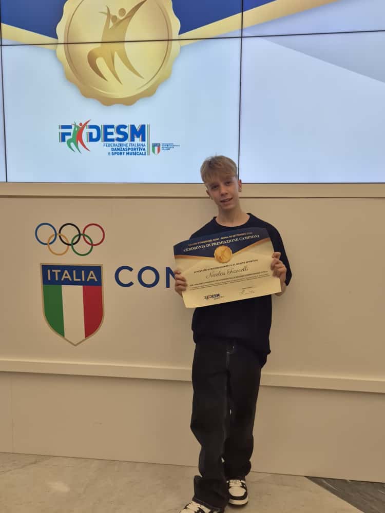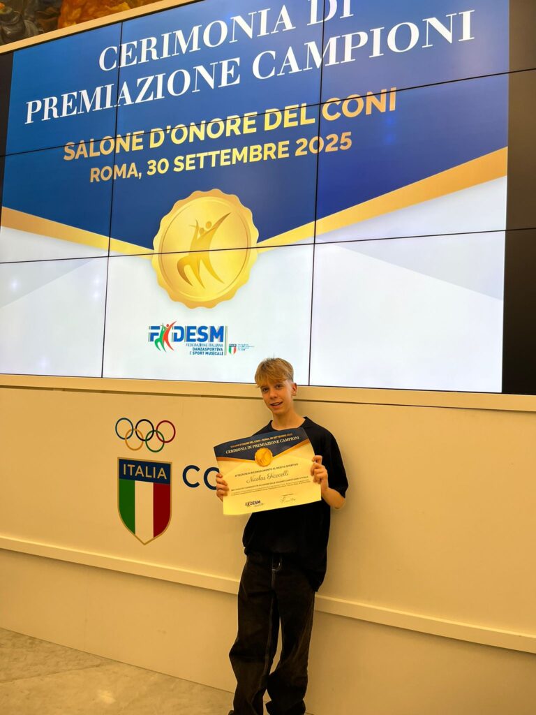 Il 30 settembre scorso, nella cornice prestigiosa del Salone d’Onore del Coni a Roma, Nicolas è stato premiato tra i Campioni della Danza Italiana per i risultati ottenuti ai Campionati Assoluti 2025. Un riconoscimento che testimonia non solo il talento, ma anche la costanza, l’impegno e la dedizione di un ragazzo che ha fatto della danza la sua ragione di vita.