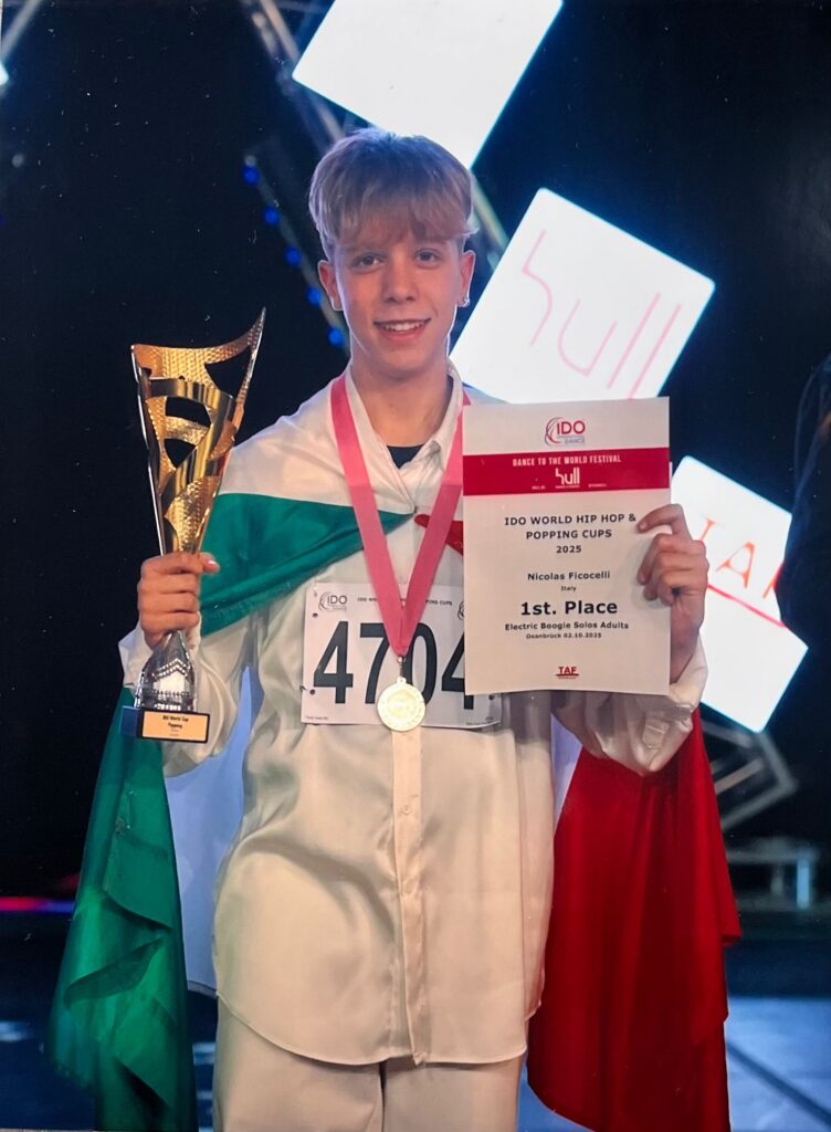 Nella disciplina dell’Hip Hop, Nicolas ha sbaragliato la concorrenza internazionale salendo sul gradino più alto del podio e conquistando la medaglia d’oro. Ha poi replicato il successo nel Popping, dove ancora una volta la sua tecnica e il suo carisma hanno catturato pubblico e giuria, regalando all’Italia un’altra medaglia d’oro. Non pago, ha aggiunto al suo straordinario palmarès anche un secondo posto nello Street Dance Show, portando a casa la medaglia d’argento e facendo risuonare per ben due volte l’inno italiano nel palazzetto tedesco.