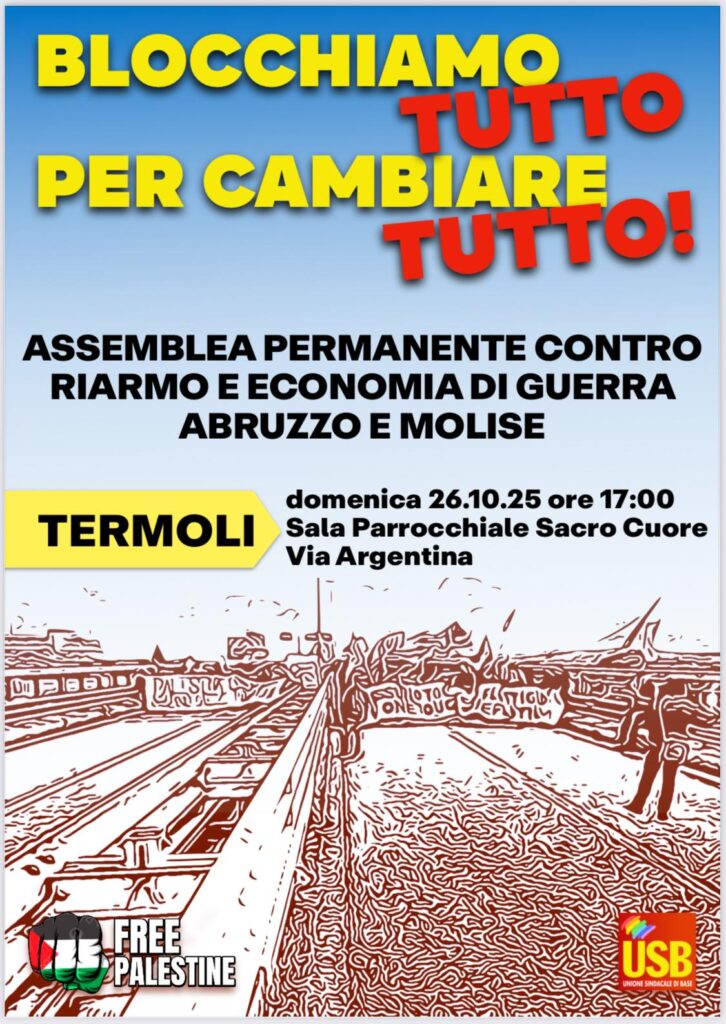 TERMOLI. Oggi, domenica 26 ottobre, alle ore 17, presso la sala parrocchiale del Sacro Cuore in via Argentina a Termoli, si terrà l’assemblea permanente contro il riarmo e l’economia di guerra promossa da Usb Abruzzo e Molise.