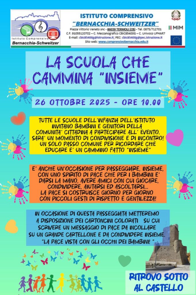 TERMOLI. Un appuntamento che unisce educazione, comunità e valori condivisi: domenica 26 ottobre 2025, alle ore 10, l’Istituto Comprensivo “Bernacchia-Schweitzer” organizza l’iniziativa “La Scuola Che Cammina ‘Insieme’”, una camminata cittadina aperta a tutti i bambini delle scuole dell’infanzia dell’Istituto e alle loro famiglie. L’evento, promosso in collaborazione con il Ministero dell’Istruzione e del Merito (Mim), si propone come un momento di condivisione, inclusione e crescita collettiva.
