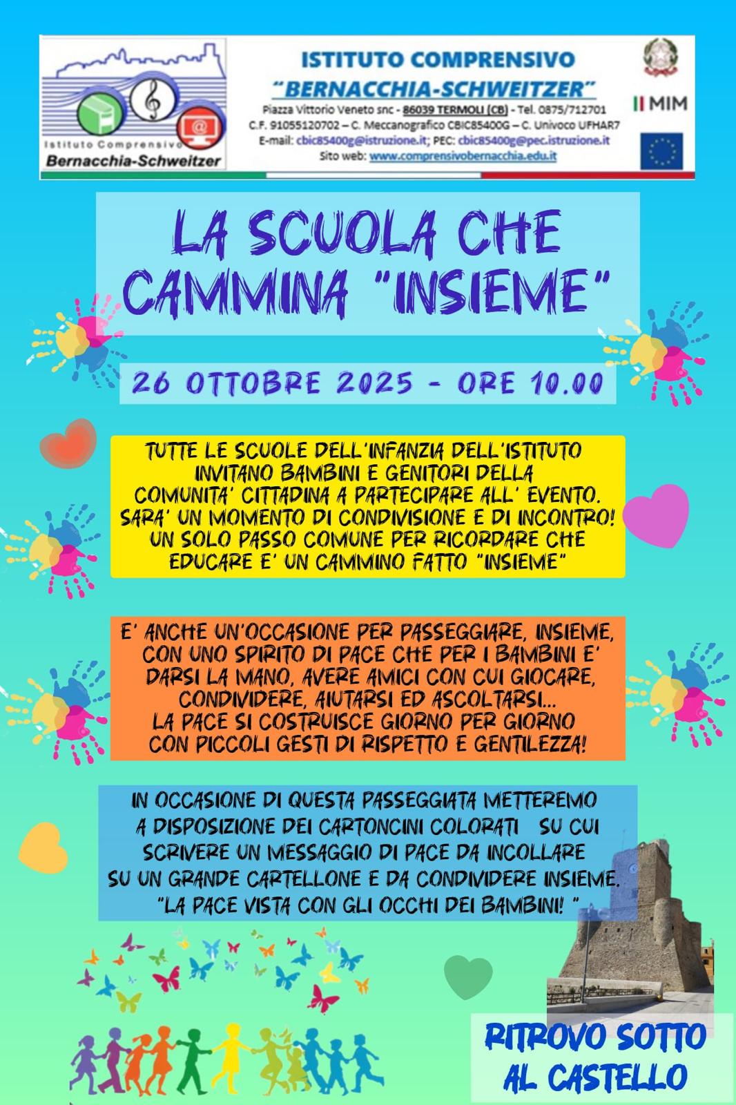 TERMOLI. Un appuntamento che unisce educazione, comunità e valori condivisi: domenica 26 ottobre 2025, alle ore 10, l’Istituto Comprensivo “Bernacchia-Schweitzer” organizza l’iniziativa “La Scuola Che Cammina ‘Insieme’”, una camminata cittadina aperta a tutti i bambini delle scuole dell’infanzia dell’Istituto e alle loro famiglie. L’evento, promosso in collaborazione con il Ministero dell’Istruzione e del Merito (Mim), si propone come un momento di condivisione, inclusione e crescita collettiva.