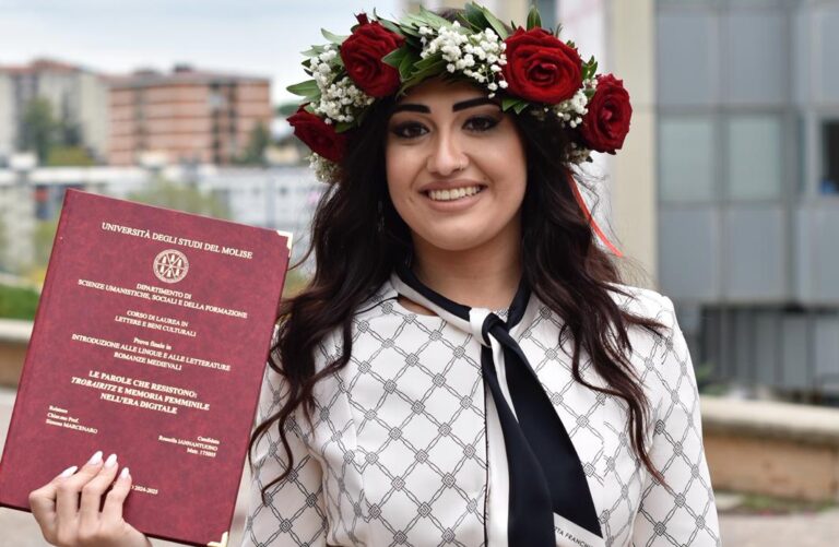 «Un traguardo importante raggiunto con impegno, sacrificio e merito, premiato da 110 su 110 e lode. Il 21 ottobre 2025 Rossella Iannantuono ha conseguito la laurea in Lettere e Beni Culturali all’Università degli Studi del Molise. La dottoressa ha discusso brillantemente una tesi in Introduzione alle lingue e alle letterature romanze medievali dal titolo “Le parole che resistono: Trobairitz e memoria femminile nell’era digitale”, relatore Ch.mo Prof. Simone Mercenaro. “Hai sempre avuto quella scintilla nei tuoi occhi, quella passione nel tuo cuore. Oggi, quella scintilla illumina il tuo percorso. Congratulazioni!”. Da mamma, papà e dalle tue sorelle».