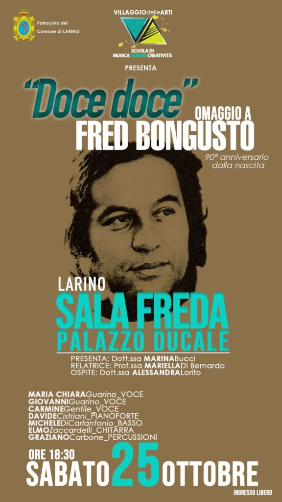 LARINO. In occasione del novantesimo anniversario della nascita di Fred Bongusto, nella città di Larino, la Scuola di musica Villaggio delle Arti celebra uno dei suoi più amati conterranei con un evento speciale nella Sala Freda del Palazzo Comunale di Larino, sabato 25 ottobre 2025 alle ore 18.30.