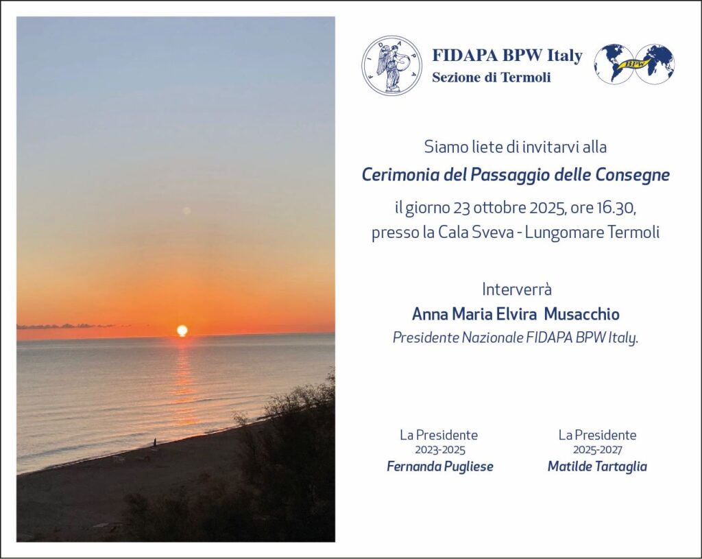 TERMOLI. La sezione di Termoli della Fidapa Bpw Italy celebra giovedì 23 ottobre 2025, alle 16.30, presso la Cala Sveva sul Lungomare, la Cerimonia del Passaggio delle Consegne.