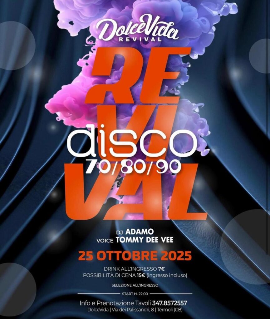 TERMOLI. C’è chi la chiama nostalgia, chi la definisce energia pura. Ma una cosa è certa: il revival musicale è tornato a far battere i cuori, e lo fa con stile. Stasera, dalle 22, il locale La Dolce Vida di Termoli, in via dei Palissandri, ospita una serata che promette di essere memorabile: Dolce Vida Revival, un viaggio sonoro tra le epoche d’oro della disco music, dagli anni Settanta fino ai Novanta.