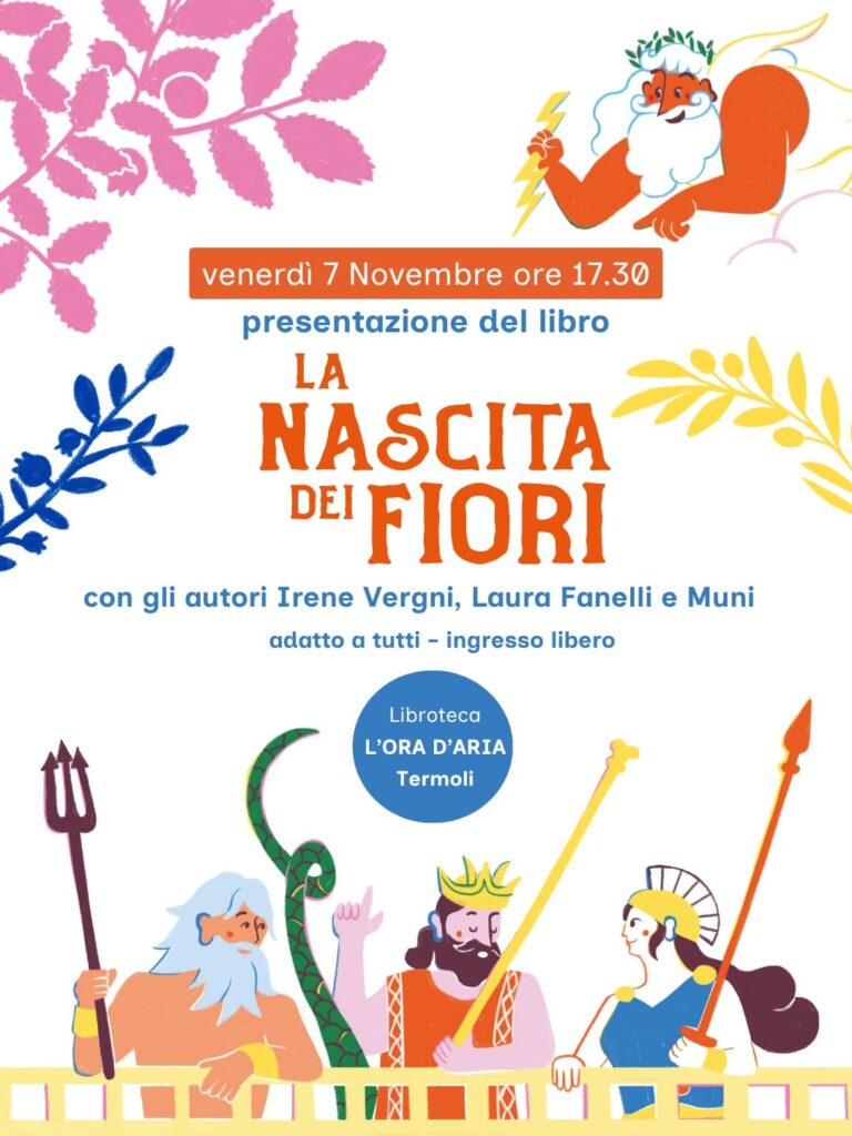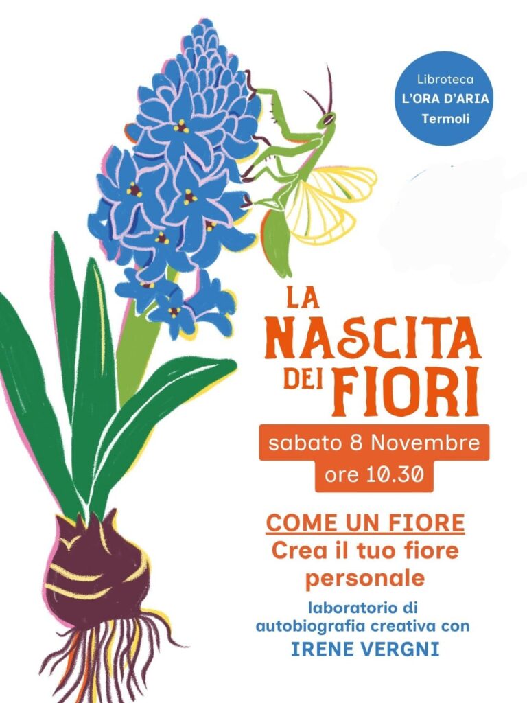 TERMOLI. La poesia della natura e la forza delle storie prendono vita a Termoli con “La nascita dei fiori”, un progetto che unisce arte, musica e letteratura in un’esperienza creativa e sensoriale. Il libro, edito da LibriVolanti, è firmato da Irene Vergni, Laura Fanelli e Muni, tre autori provenienti da Toscana e Molise, che si riuniranno nella città adriatica per una serie di appuntamenti speciali in collaborazione con la Libroteca L’Ora d’Aria, che festeggia i suoi due anni di attività.