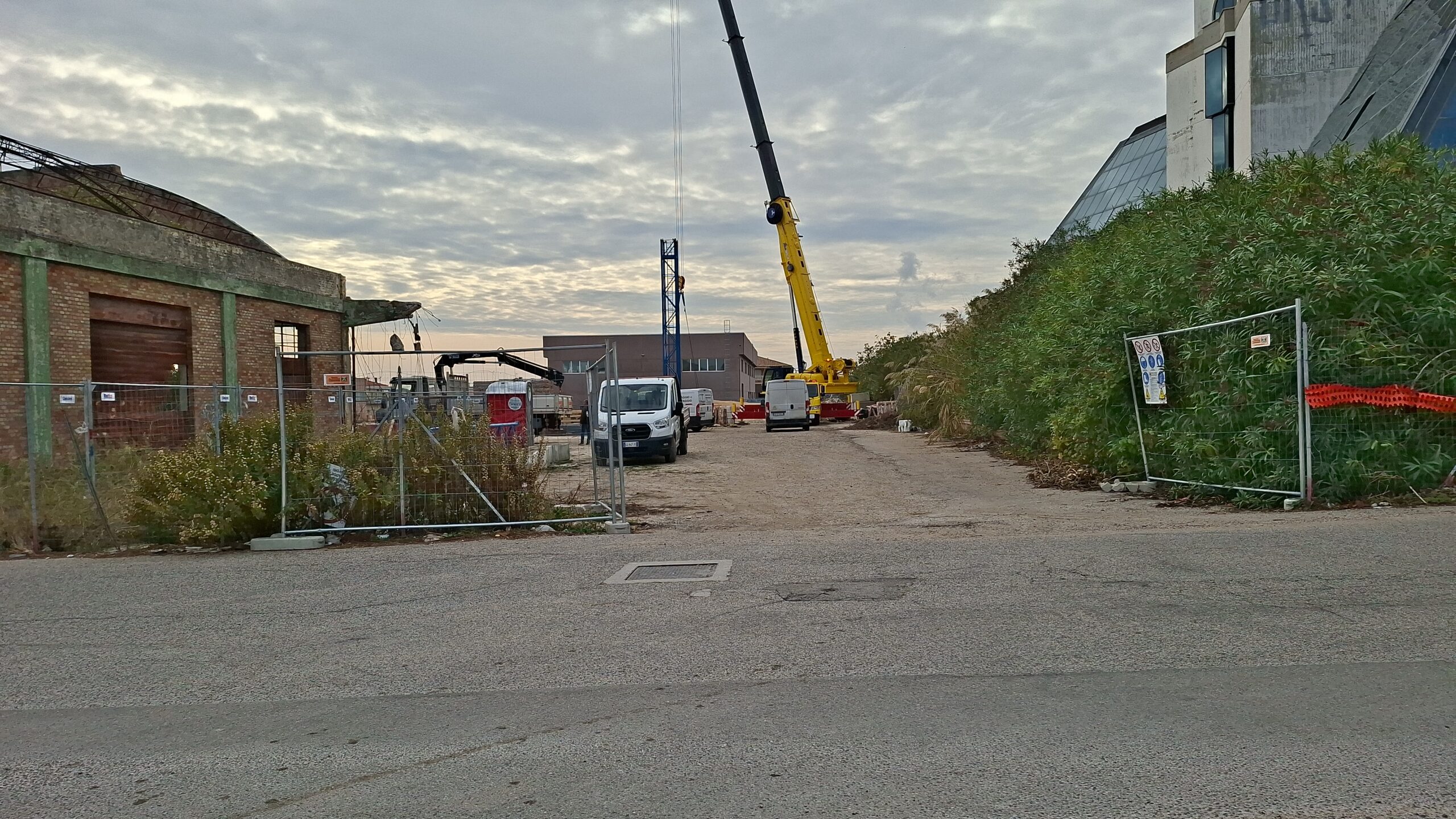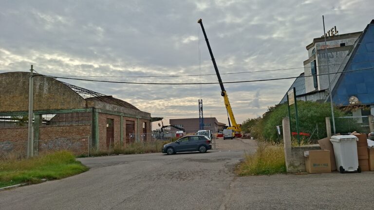 La presenza del mezzo è legata alla costruzione di una gru fissa, che servirà per il trasporto di materiale edile e non solo, all’interno dell’area dell’ex betoniera.