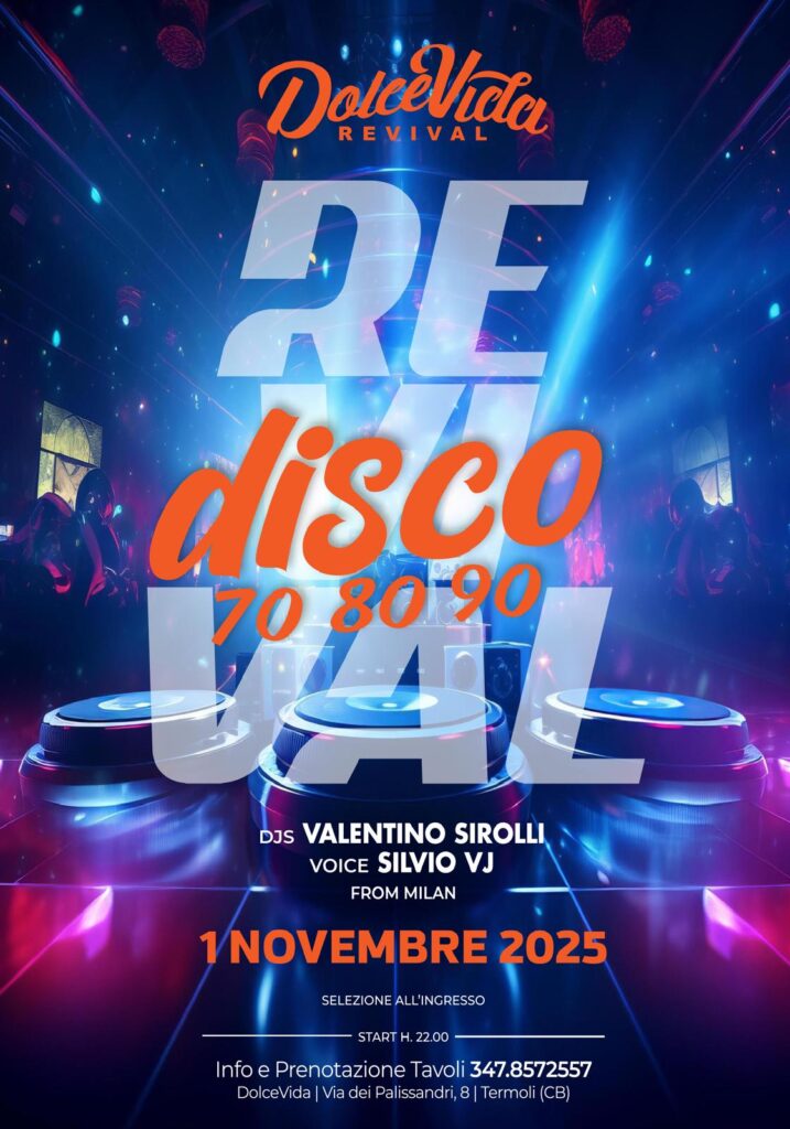 Domani, sabato 1° novembre 2025, dalle ore 22.00, il locale DolceVida di Termoli, in via dei Palissandri 8, ospita una serata che promette di essere memorabile: Dolce Vida Revival, un viaggio sonoro tra le epoche d’oro della disco music, dagli anni Settanta fino ai Novanta.