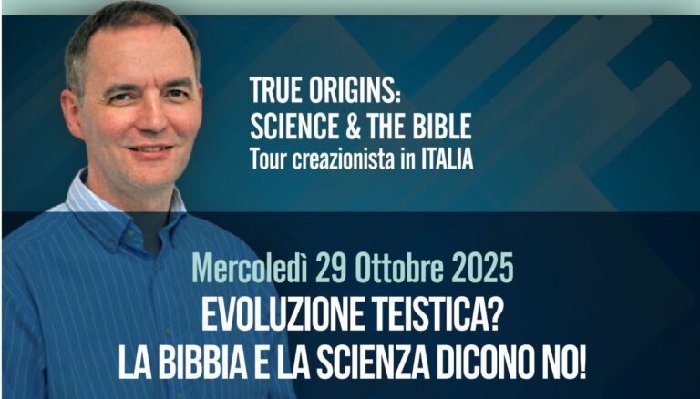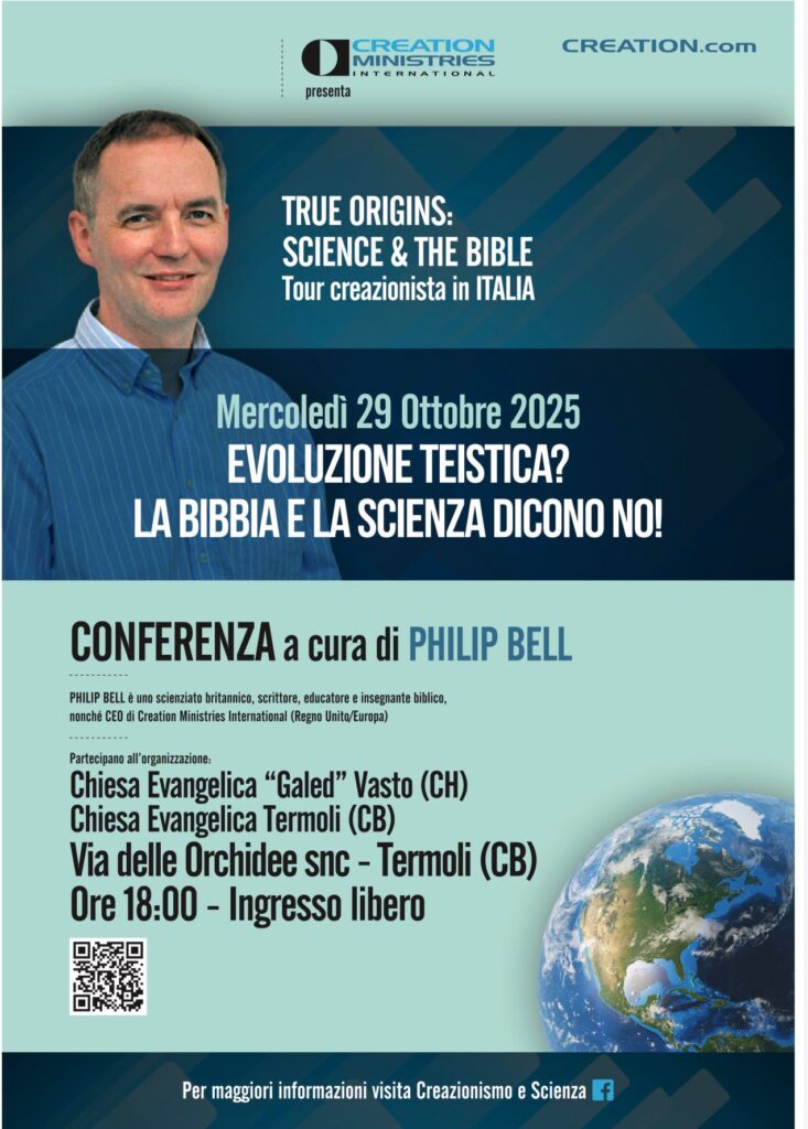 Relatore della serata sarà Philip Bell, scienziato, autore e Ceo della sezione UK/Europe di Creation Ministries International, che presenterà un intervento dal titolo: “Evoluzione Teistica? La Bibbia e la Scienza dicono NO!”. La conferenza intende mettere in discussione la compatibilità tra la narrazione biblica della creazione e le teorie evolutive che cercano di conciliare fede e scienza.
