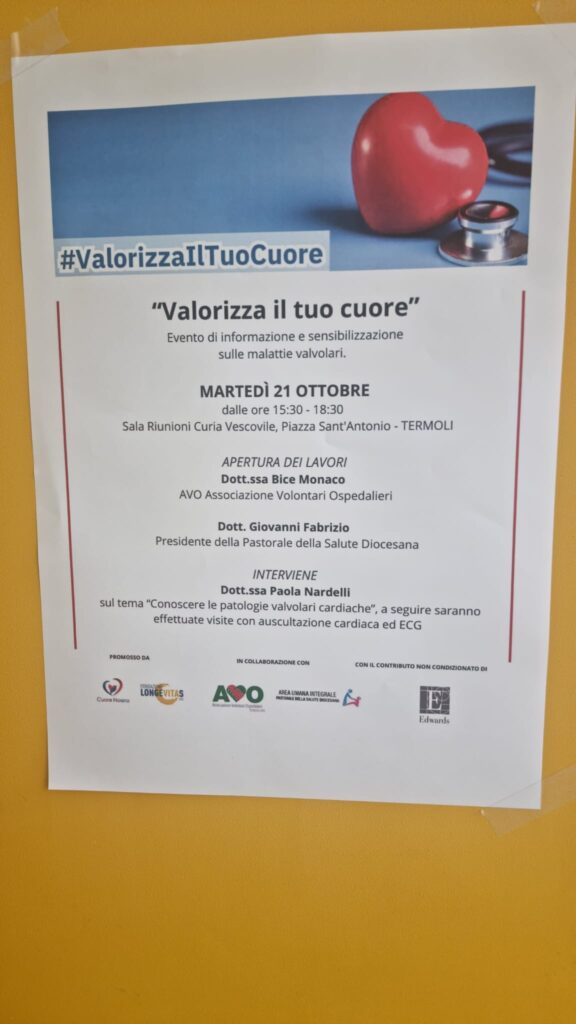 TERMOLI. Martedì 21 ottobre, dalle 15:30 alle 18:30, si terrà nella Sala Riunioni della Curia Vescovile di Piazza Sant’Antonio l’evento “Valorizza il tuo cuore”, dedicato all’informazione e alla sensibilizzazione sulle malattie valvolari cardiache.