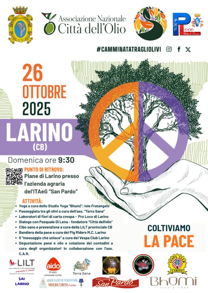 LARINO. È tutto pronto per la “Camminata tra gli olivi- Coltiviamo la pace”, che si svolgerà a Larino domani, domenica 26 ottobre 2025, nell’ambito della IX edizione della Giornata nazionale promossa dall’Associazione Città dell’Olio.