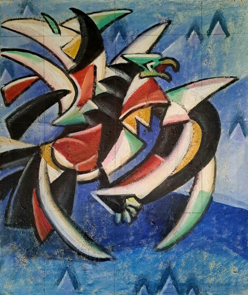 Nato in Albania nel 1913, Ibrahim Kodra ha vissuto a Milano ove ha frequentato l’Accademia di Brera ed è stato allievo, tra gli altri, del nostro Carlo Carrà… Ma Kodra ha vissuto l’Italia a tutto tondo, non ci ha solo studiato… immerso nella nostra storia e nella nostra politica – con la fierezza indomita degli Albanesi di ieri e di oggi – ha frequentato i cenacoli intellettuali dell’epoca, ha partecipato attivamente alla Resistenza Italiana, ha avuto rapporti significativi con i grandi artisti dell’epoca, in particolare con Pablo Picasso, sin dal 1948, e con lui ha condiviso il pensiero politico, una profonda amicizia e una reciproca stima (Picasso affermava che già la firma autografa di Kodra è un’opera d’arte).