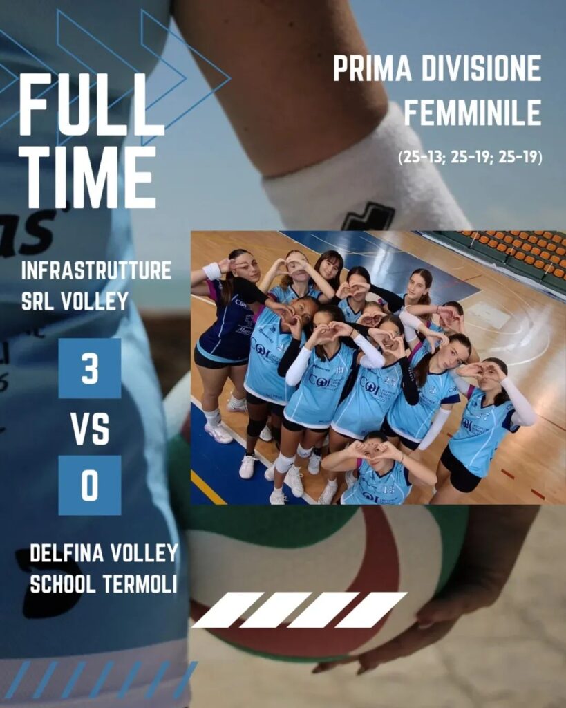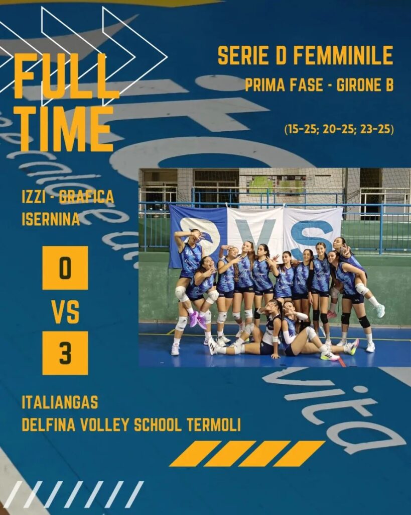 Grande soddisfazione per la Delfina Volley School Termoli, che conquista la sua prima vittoria storica in Serie D, battendo Izzi Grafica Isernina 3-0 (15-25; 20-25; 23-25).
