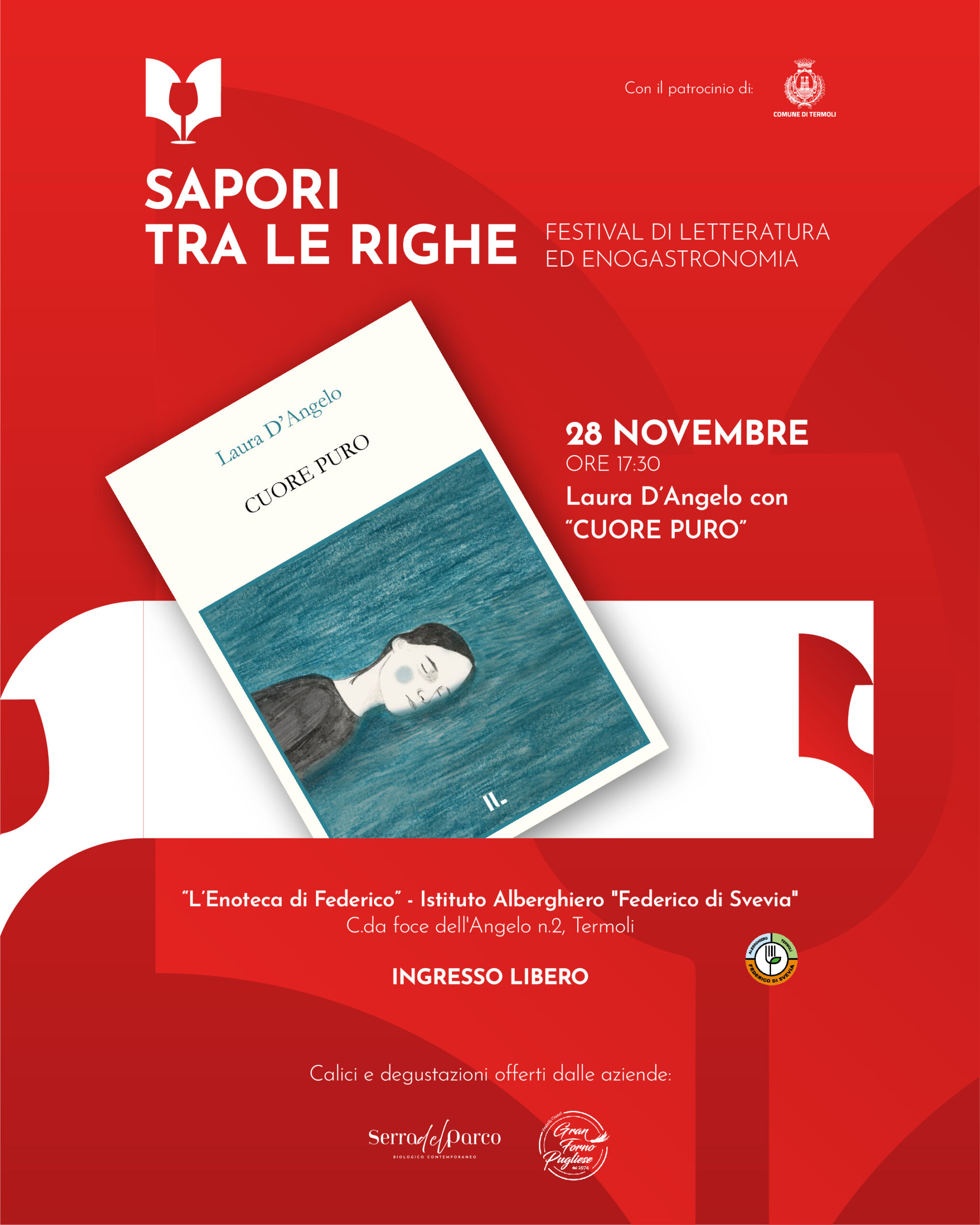 TERMOLI. Terzo appuntamento, venerdì 28 novembre, con il Festival della letteratura e dell’enogastronomia “Sapori tra le righe”. Ospiti dell’evento saranno la scrittrice Laura D’Angelo, che ci parlerà d’amore e sentimenti attraverso le pagine del suo libro, “Cuore puro”, e l’azienda Serra del Parco di Palata, che offrirà degustazioni di vini, oli aromatici ed altri squisiti prodotti, tutti rigorosamente biologici.