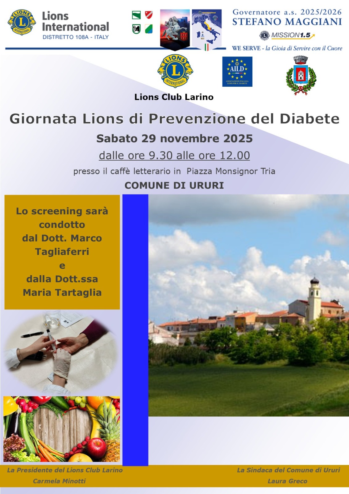 URURI. Ururi si prepara a vivere una mattinata interamente dedicata alla salute e alla prevenzione: sabato 29 novembre, dalle 9.30 alle 12, il Caffè Letterario di Piazza Monsignor Tria ospiterà la giornata Lions di screening gratuito per il diabete, iniziativa promossa dal Lions Club Larino in collaborazione con l’Associazione Italiana Lions per il Diabete e con il patrocinio del Comune di Ururi; un service itinerante che porta sul territorio la missione globale lionistica di contrasto al diabete, trasformando la piazza in presidio di diagnosi precoce e consulenza medica, grazie all’impegno diretto dei soci medici del Club, il dottor Marco Tagliaferri e la dottoressa Maria Tartaglia, affiancati dai volontari Lions per accoglienza e logistica.