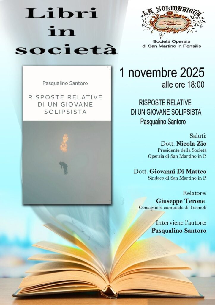 La Società Operaia “La Solidarietà” di San Martino in Pensilis organizza l’incontro “Libri in società”, un’iniziativa che mira a promuovere la lettura e il dibattito intellettuale all’interno della comunità. L’evento si terrà alle ore 18 presso la sede dell’associazione, e vedrà protagonista il libro “Risposte Relative di un Giovane Solipsista”, opera del giovane autore Pasqualino Santoro.