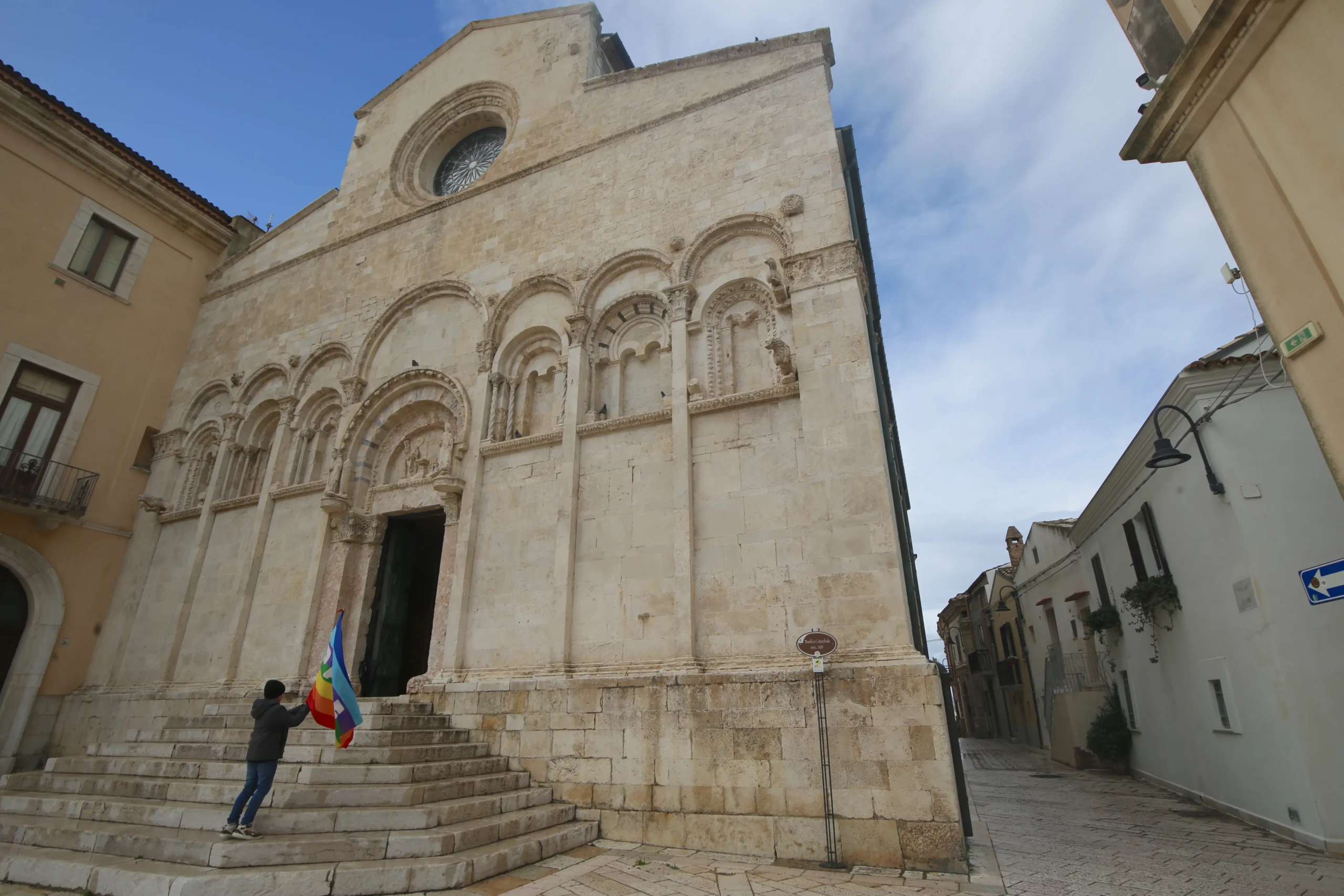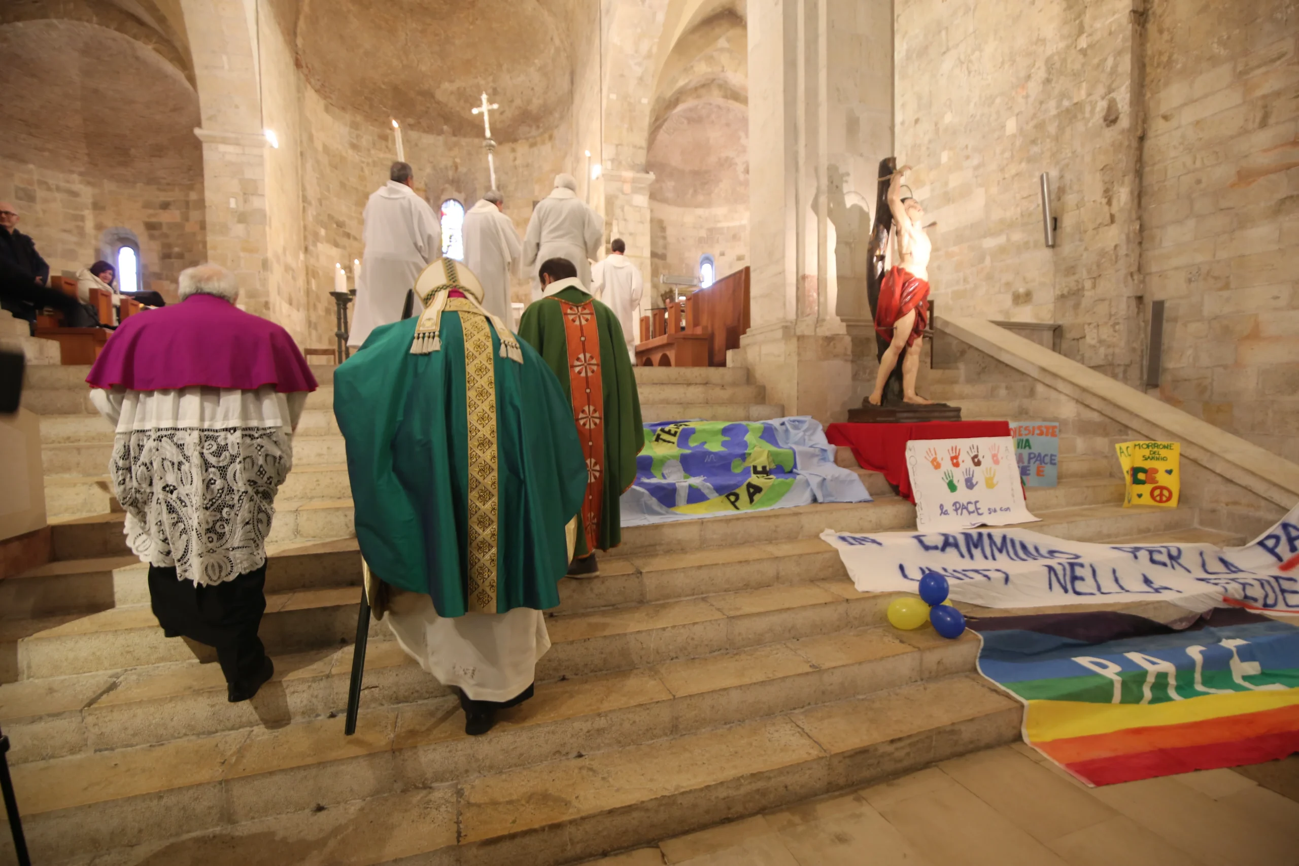 La mattinata si è aperta in piazza Duomo con l’accoglienza dei gruppi provenienti da tutta la diocesi. Alle 10.30 la celebrazione eucaristica presieduta dal vescovo Claudio Palumbo ha riempito la Cattedrale, tra canti, letture e i colori dei cartelloni preparati dall’Azione Cattolica Ragazzi. Poi, all’uscita, la scelta: andare avanti comunque. E così è stato. Sotto la pioggia, il corteo ha preso forma e voce, portando per le vie del centro striscioni, bandiere arcobaleno, messaggi scritti dai più piccoli: “Il mondo ha bisogno di pace”, “Camminiamo uniti”, “Immaginiamo un mondo di pace”.