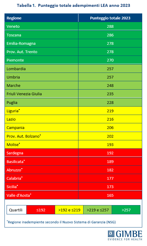 In Molise: nel 2023 (ultimo anno disponibile) a fronte di un punteggio medio nazionale di 226 punti, il punteggio totale degli adempimenti della Regione ai Livelli Essenziali di Assistenza (LEA) è di 193. La Regione, inadempiente secondo il Nuovo Sistema di Garanzia (NSG), ha registrato i seguenti punteggi nelle tre aree monitorate (prevenzione collettiva e sanità pubblica, assistenza distrettuale ed assistenza ospedaliera):