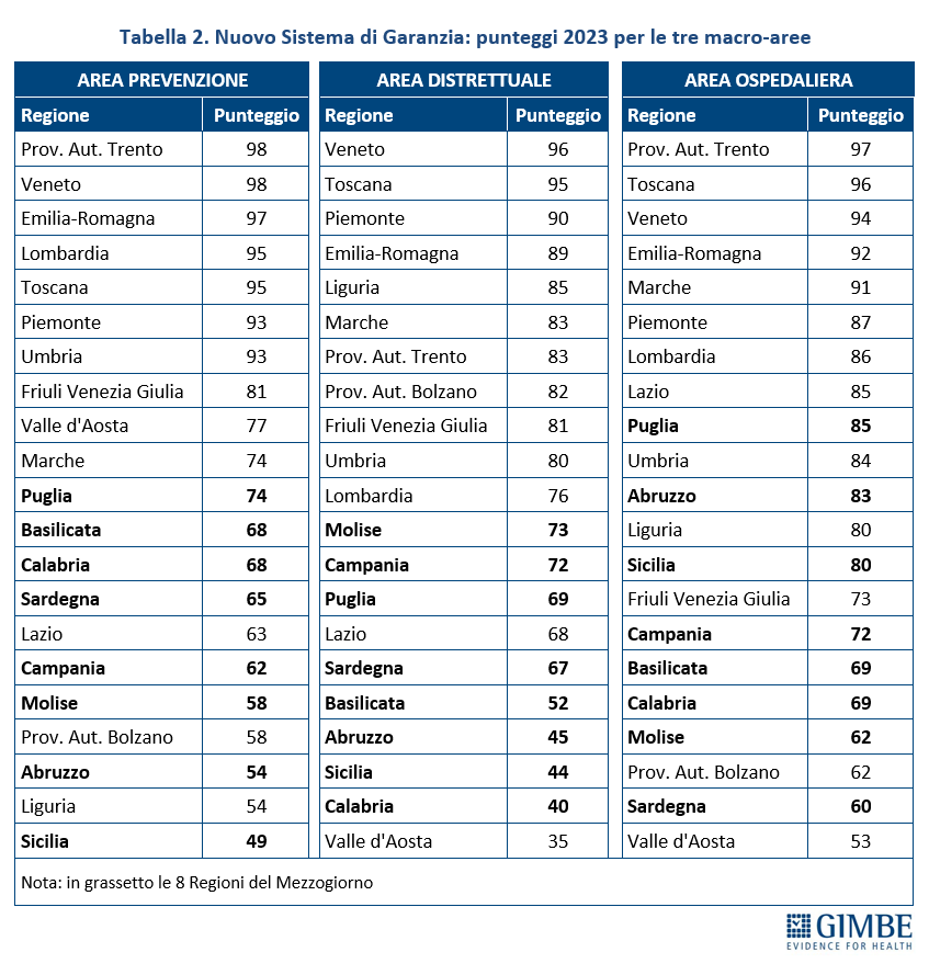 LE DISEGUAGLIANZE REGIONALI. In sanità qualsiasi discussione sui LEP non può prescindere da una valutazione delle attuali diseguaglianze regionali nell’erogazione dei LEA, ovvero le prestazioni e i servizi che il Servizio sanitario nazionale (SSN) è tenuto a fornire a tutti i cittadini, gratuitamente o con il pagamento di un ticket. Il monitoraggio ufficiale del Ministero della Salute tramite gli indicatori del Nuovo Sistema di Garanzia (NSG) fotografa profonde differenze tra le Regioni. Nel 2023 (ultimo anno disponibile) ben 8 Regioni risultano non adempienti ai LEA non raggiungendo la soglia minima di 60 punti su 100 in almeno una delle tre macro-aree: prevenzione, distrettuale e ospedaliera. Inoltre, sommando i punteggi ottenuti nelle tre macro-aree, a fronte di un punteggio medio di 226 punti su 300, esistono divari molto marcati: Veneto e Toscana superano i 280 punti, mentre altre Regioni non raggiungono i 200 punti, in particolare nel Mezzogiorno (Abruzzo, Basilicata, Calabria, Molise, Sicilia) e in Valle d’Aosta (tabella 1). Infine, in ciascuna macro-area, il divario tra le Regioni con le migliori performance e quelle in maggiore difficoltà supera i 40 punti, arrivando in alcune aree a scarti ancora maggiori, con criticità soprattutto sull’assistenza territoriale e sulla prevenzione, concentrate soprattutto al Sud (tabella 2). «Tenendo conto che il NSG fornisce solo un quadro generale sull’adempimento dei LEA – ha evidenziato Cartabellotta – ma non misura l’effettiva qualità dell’assistenza erogata né tantomeno l’effettiva esigibilità del diritto costituzionale alla tutela della salute, l’entità delle diseguaglianze regionali e territoriali è largamente sottostimata».