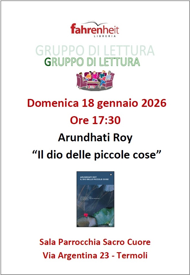 TERMOLI. Domenica 18 gennaio, alle ore 17:30, la libreria Fahrenheit ospiterà un nuovo incontro del suo gruppo di lettura, eccezionalmente presso la Sala Convegni della Parrocchia Sacro Cuore di Termoli. Al centro della discussione ci sarà il romanzo “Il dio delle piccole cose” di Arundhati Roy (TEA, traduzione di Chiara Gabutti).