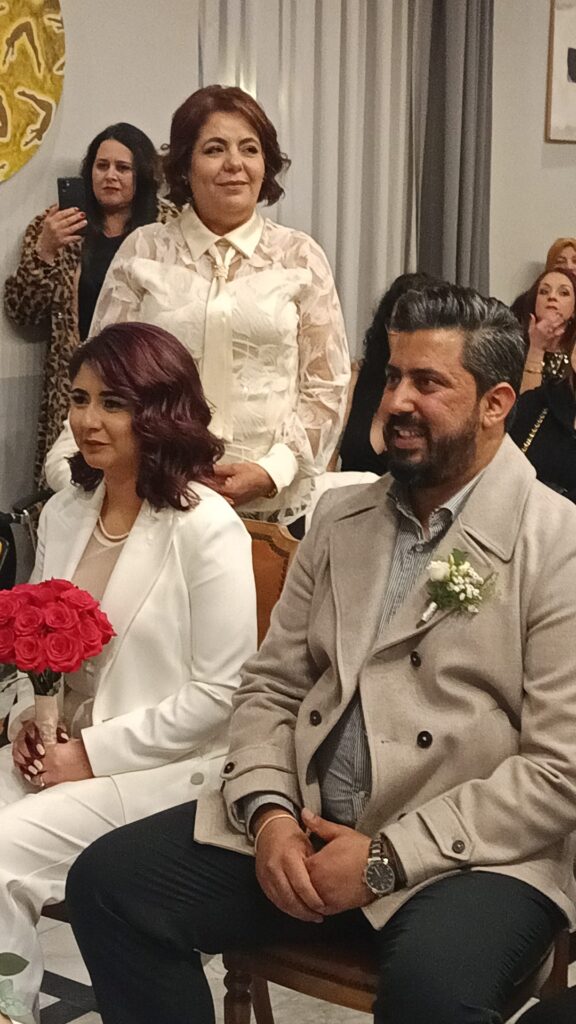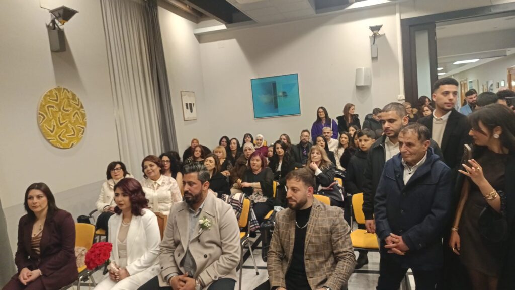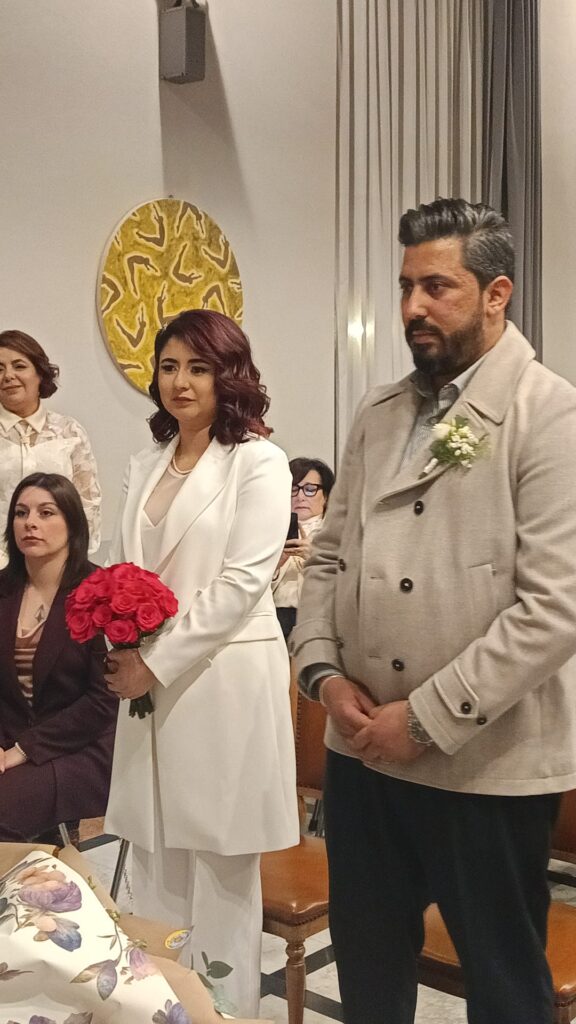 Il rito ha avuto un inizio solenne e toccante con la recita di una preghiera in lingua araba, simbolo delle radici e della spiritualità della coppia. Un elemento fondamentale che ha caratterizzato l’intera celebrazione è stata la presenza di un’interprete la Signora Najah Banour il cui ruolo si è rivelato prezioso e indispensabile: traducendo ogni parola del Sindaco in lingua araba e nei dialetti d’origine, ha permesso ai parenti dello sposo collegati da lontano di seguire ogni istante del “Sì”. È stato un gesto di profondo rispetto, che ha annullato le distanze geografiche e linguistiche, facendo sentire tutti parte di un unico, grande abbraccio.