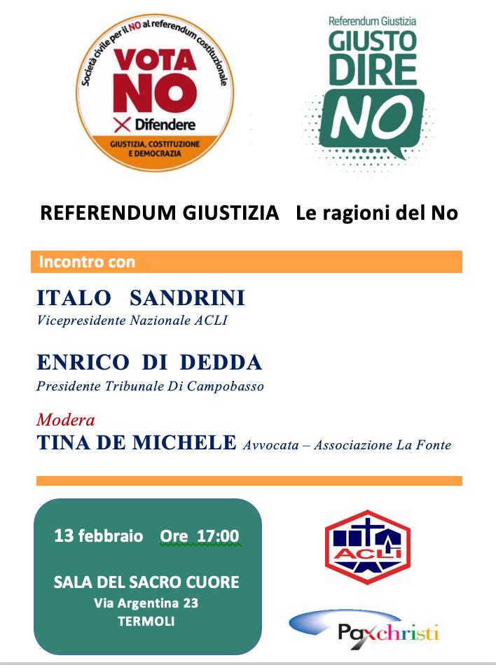 TERMOLI. In una città che da sempre vive la partecipazione come un gesto concreto, quasi fisico, il confronto sul referendum giustizia torna a occupare spazio, voce e responsabilità. Venerdì prossimo, 13 febbraio, nella Sala del Sacro Cuore di via Argentina, Termoli ospita un appuntamento che non è semplice divulgazione, ma un atto di cittadinanza: “Referendum Giustizia – Le ragioni del No”, promosso da Acli, Pax Christi e realtà associative che da anni presidiano il terreno fragile del dibattito pubblico.