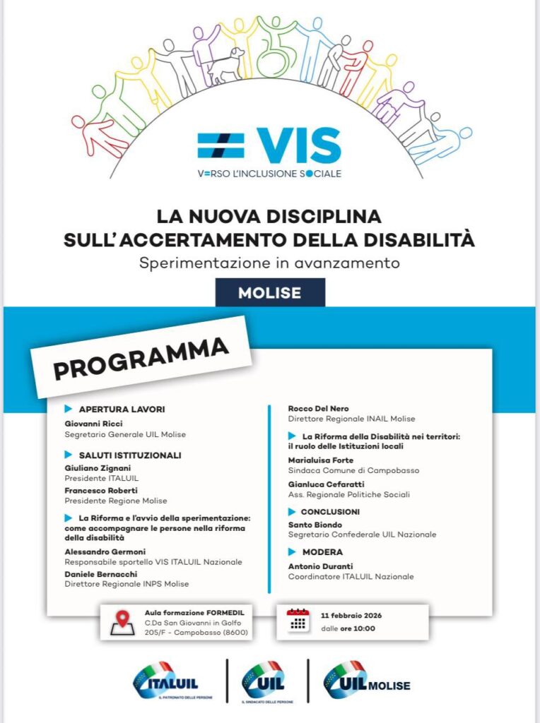 CAMPOBASSO. Mercoledì 11 febbraio 2026, a partire dalle ore 10 presso l’Aula Formazione Formedil in C.da San Giovanni in Golfo 205/F a Campobasso, si terrà il convegno regionale “La nuova disciplina sull’accertamento della disabilità – Sperimentazione in avanzamento”, promosso dalla UIL Molise in collaborazione con l’Itauil nazionale.