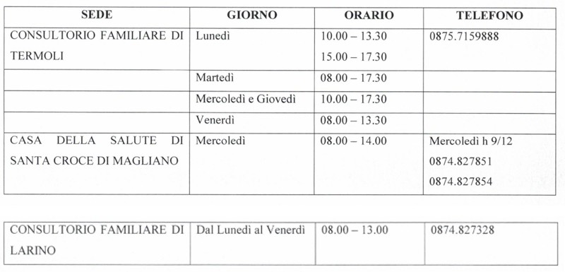 L’ostetrica sarà disponibile a Montenero di Bisaccia, presso la Casa della Salute, ogni lunedì dalle 10:30 alle 16:30, e a Castelmauro, sempre presso la Casa della Salute, ogni venerdì dalle 09:00 alle 13:00.