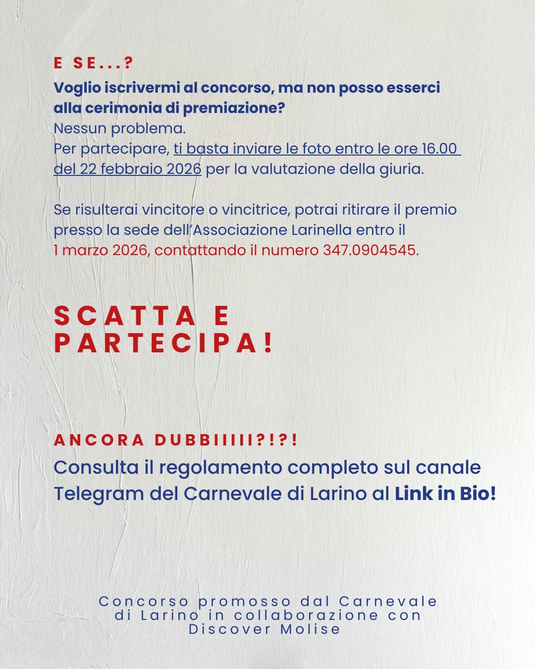 Il concorso è promosso dal Carnevale di Larino, in collaborazione con Discover Molise. Tutte le informazioni e il regolamento completo sono disponibili sul canale Telegram ufficiale.