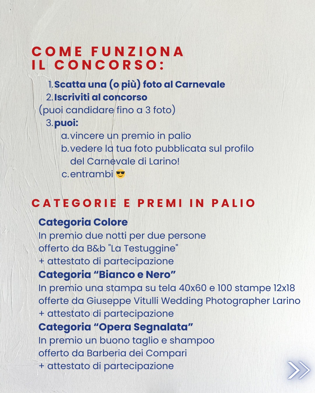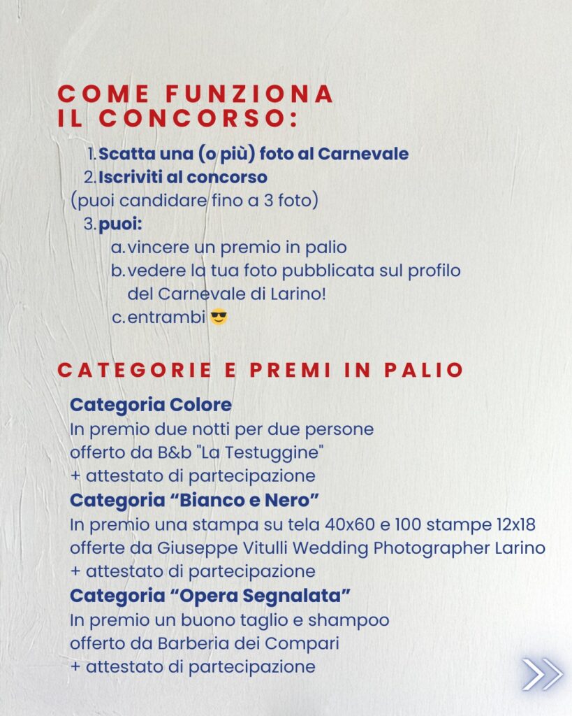 LARINO. Il Carnevale di Larino torna a farsi raccontare dagli occhi di chi lo vive. Anche per il 2026, il concorso fotografico invita appassionati e curiosi a catturare l’essenza della festa: i colori, i volti, i dettagli che animano le sfilate.