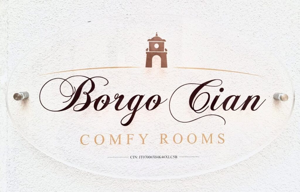 Il Borgo Cian non è un corpo estraneo al paese, ma ne rivendica orgogliosamente l’identità. Lo si nota fin dal logo, studiato personalmente dai titolari, che integra i simboli iconici di San Giacomo: l’orologio (U’ Ruloje) e il Colle, il belvedere che domina il boschetto e il mare.