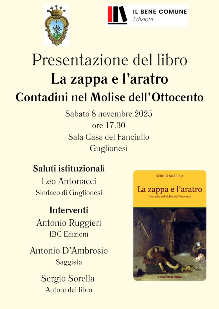 GUGLIONESI. Sabato 8 novembre 2025, alle ore 17:30, Guglionesi ospita un viaggio nella vita contadina dell’Ottocento con la presentazione del libro La zappa e l’aratro. Contadini nel Molise dell’Ottocento di Sergio Sorella, edito da IBC Edizioni, presso la Casa del Fanciullo, Largo Garibaldi. Insieme a Sorella ci saranno il sindaco Leo Antonacci, Antonio Ruggieri e Antonio D’Ambrosio.